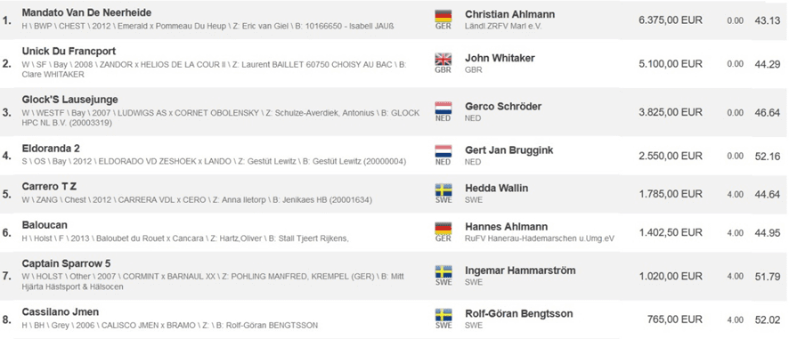 Montado pelo cavaleiro top Rolf-Göran Bengtsson, da Suécia, o BH zerou o percurso inicial elaborado por Frank Rothenberger, da Alemanha, e habilitou-se ao desempate com mais 12 conjuntos. O conjunto terminou na oitava colocação com uma falta em 52s02.